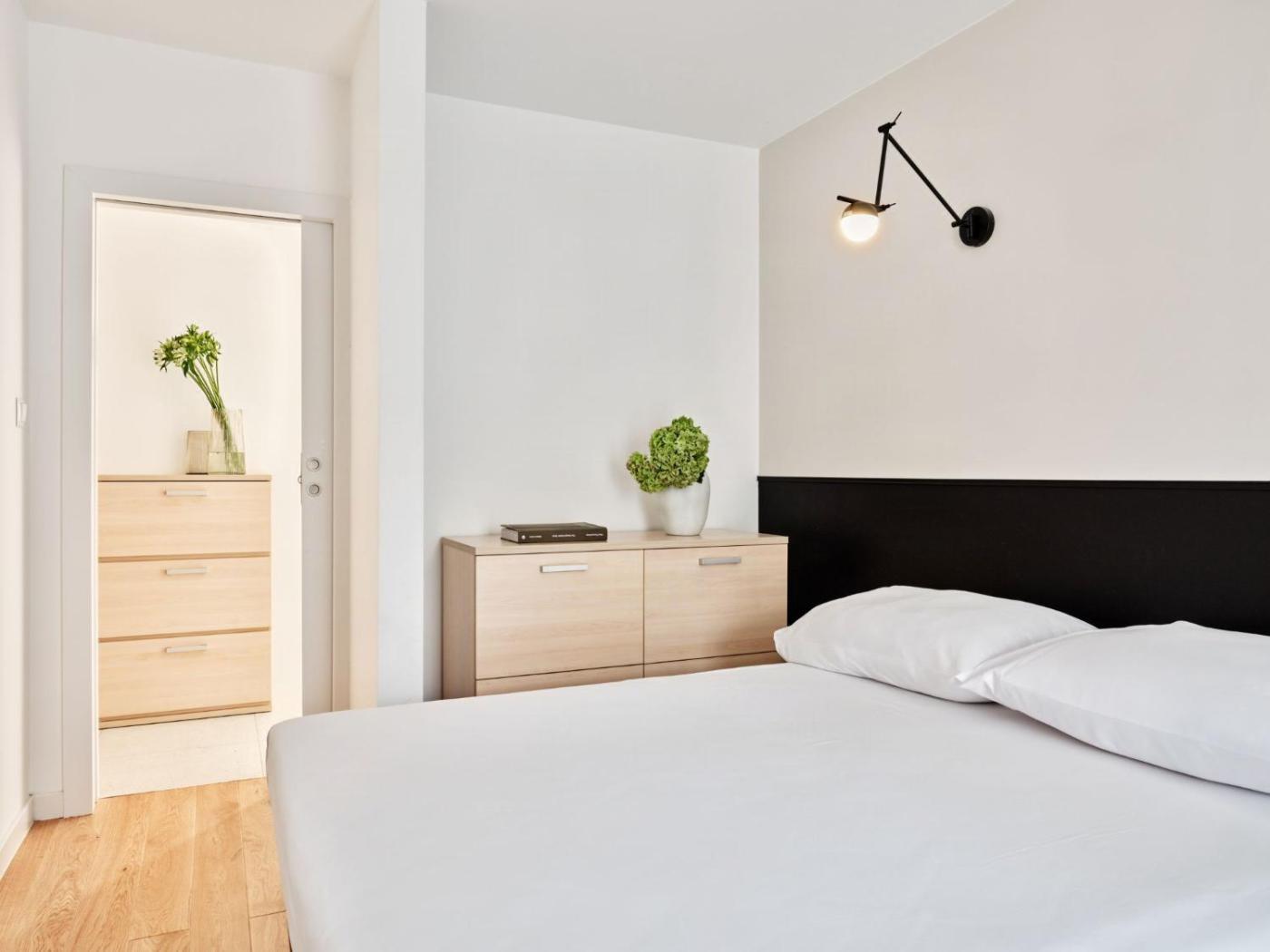 W sypialni przygotowano komfortową przestrzeń, gdzie można znaleźć pościel oraz szafę lub garderobę na ubrania. Z myślą o gościach, każdy apartament jest również wyposażony w budzik oraz dźwiękoszczelność, co gwarantuje spokojny sen i komfortowy wypoczynek. W salonie dostępne jest biurko, idealne dla osób pracujących zdalnie.